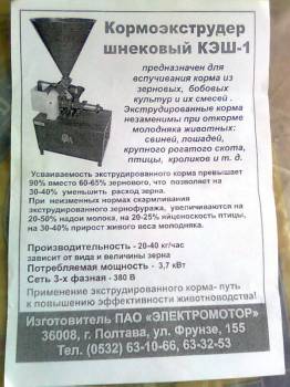| Купил экструдер уже как год, привесов волшебных нет, хорошая экономия кормов это 100%. Тут нужно как и в комбикорме найти хороший баланс, и как то определить клетчатку, усваиваемый протеин и прочее на выходе, тогда можно получить хорошие привесы и малую себестоимость корма. Добавлено (17.05.2012, 10:30) --------------------------------------------- Сосед скормил на меньшее количество зверей уже вдвое больше чем я. Да и ориентируясь на прошлый год, зерно закончилось ранней весной, тогда как сейчас еще на пару месяцев есть, и при этом количество поголовья на много больше.