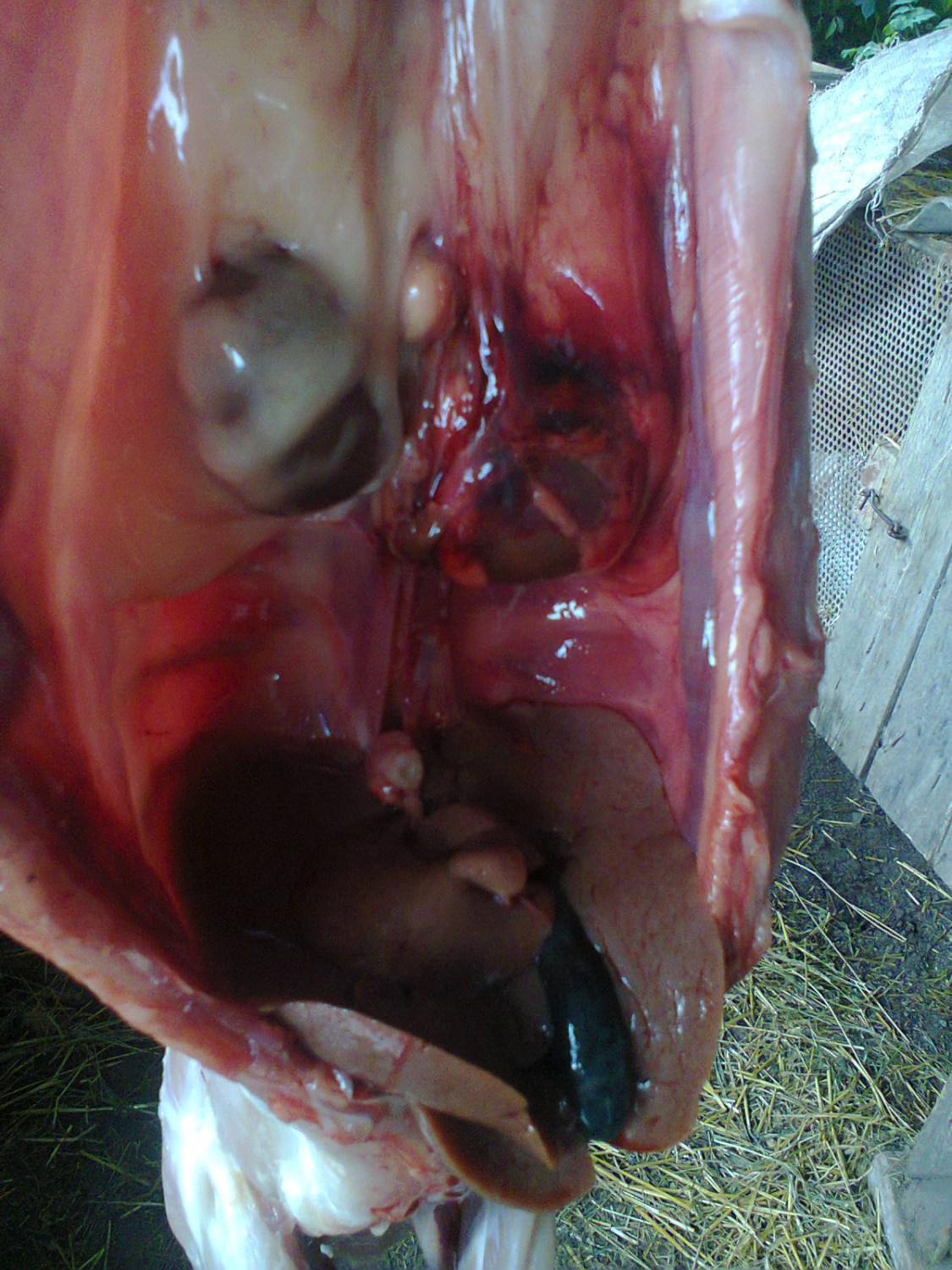 Цитата Патологоанатомические изменения. При остром течении фасциолеза печень увеличена, переполнена кровью, па поверхности заметны кровоизлияния и серовато-желтые пленки фибрина.В брюшной полости нередко обнаруживают кровянистый транссудат (до 10 л и более), в котором находят молодых фасциол. Если интенсивность инвазии высокая, отмечают значительные кровотечения в брюшную полость и бледность слизистых оболочек.